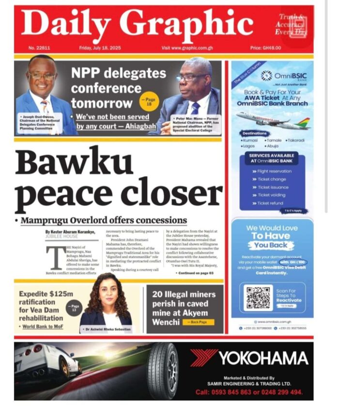 Newspaper headlines: Friday, July 18, 2025 Newspaper Headlines July 18, 2025 7:03 am - Audio By Carbonatix FacebookWhatsAppTwitterTelegramEmailPinterestPrint Previous articleUS passes first major national crypto legislationNext articleGAF set to recruit 12,000 personnel TagsNewspaper headlines RELATED ARTICLES Local News Asantehene demands enforcement of law recognising Naba Azoka II as Bawku Chief Local News Government to issue position on Bawku peace mediation report within 24 hours Local News Bryan Acheampong says Bawumia is his biggest competitor in NPP race