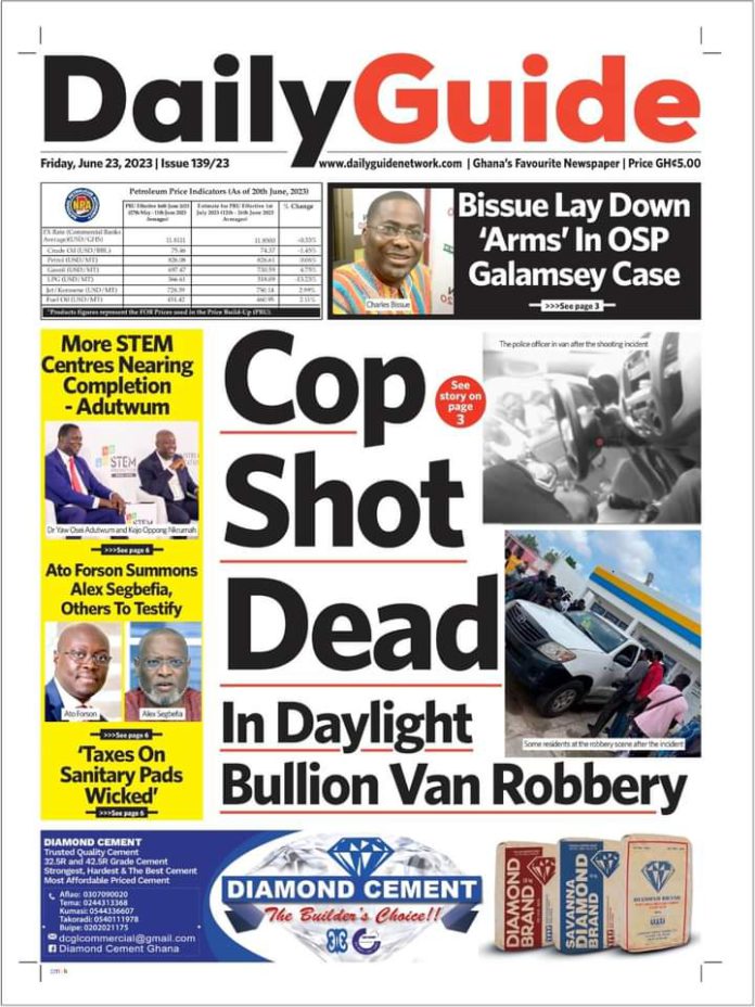 Newspaper Headlines: Friday, June 23, 2023 SourceAdomonline.com Newspaper Headlines June 23, 2023 6:40 am - Audio By Carbonatix FacebookWhatsAppTwitterTelegramEmailPinterestPrint Previous articleA/R: 4 people including a six-year-old boy drown in floodsNext articlePhoto of police officer killed in daylight robbery attack at Ablekuma pops up RELATED ARTICLES Newspaper Headlines Newspaper headlines: Monday, November 24, 2025 Newspaper Headlines Newspaper headlines: Friday, November 21, 2025 Newspaper Headlines Newspaper headlines: Thursday, November 20, 2025