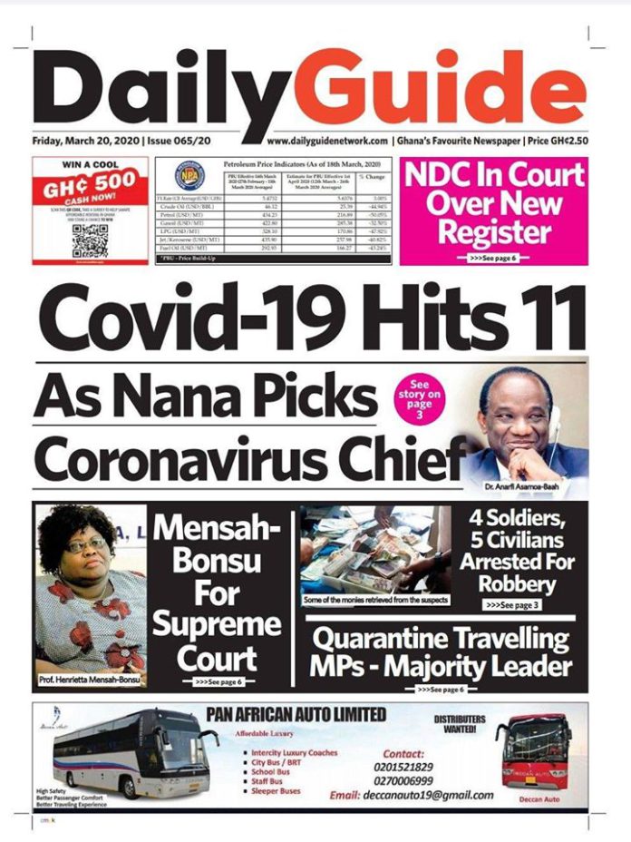 Newspaper Headlines: Friday, March 20, 2020 Newspaper HeadlinesUncategorized March 20, 2020 7:51 am - Audio By Carbonatix FacebookWhatsAppTwitterTelegramEmailPinterestPrint Previous articleCoronavirus: Ashesi University provides students with free 10GB data for online classesNext articleTwo arrested for drinking disinfectant to avoid coronavirus RELATED ARTICLES Newspaper Headlines Newspaper headlines: Monday, November 24, 2025 Newspaper Headlines Newspaper headlines: Friday, November 21, 2025 Newspaper Headlines Newspaper headlines: Thursday, November 20, 2025