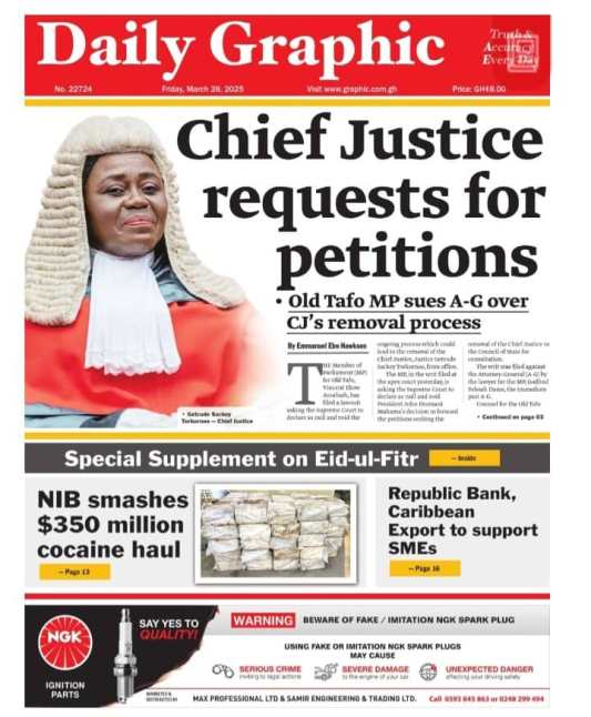 Newspaper headlines: Friday, March 28, 2025 Newspaper Headlines March 28, 2025 7:57 am - Audio By Carbonatix FacebookWhatsAppTwitterTelegramEmailPinterestPrint Previous articleDani Alves defender acquitted of sexual assault, prison sentence overturned after appealNext articleAnnoh-Dompreh calls for dedicated fund to maintain sports facilities TagsNewspaper headlines RELATED ARTICLES Local News Minority calls for Lands Minister’s removal over withdrawn Lithium Agreement Entertainment I’m divorced – Nana Ama Mcbrown reveals Local News Obuasi Police arrest 40 suspects in coordinated anti-crime operations