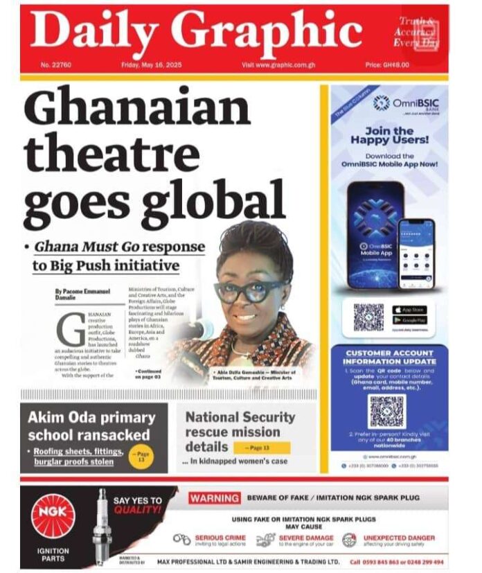 Newspaper headlines: Friday, May 16, 2025 Newspaper Headlines May 16, 2025 6:45 am - Audio By Carbonatix FacebookWhatsAppTwitterTelegramEmailPinterestPrint Previous articleWoman busted with fake aphrodisiacs appears in courtNext articleFormer Chief Justice Anin-Yeboah elected Deputy Chairperson of FIFA’s Adjudicatory Chamber TagsNewspaper headlines RELATED ARTICLES Local News Republic Bank begins solar-powered borehole project at Taviefe SHS Politics Annoh-Dompreh demands Ministerial reshuffle as absences stall Parliament Local News Kpandai: Supreme Court’s decision to suspend rerun surprising but fair – Justice Abdullai