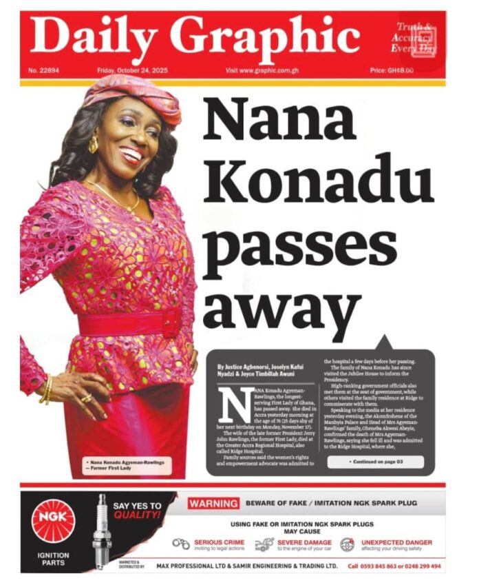 Newspaper headlines: Friday, October 24, 2025 Newspaper Headlines October 24, 2025 6:54 am - Audio By Carbonatix FacebookWhatsAppTwitterTelegramEmailPinterestPrint Previous articleNana Konadu’s family breaks silence on her death, appeals for privacyNext articleNDC mourns Nana Konadu Agyeman-Rawlings in glowing tribute TagsNewspaper headlines RELATED ARTICLES Local News NPP denies involvement in bee attack on NDC supporters Local News Bee Attack: NPP allegedly brought three mallams from Niger to Kpandai – Mustapha Gbande Local News Supreme Court will dismiss Kpandai case; it lacks merit – Tanko Computer