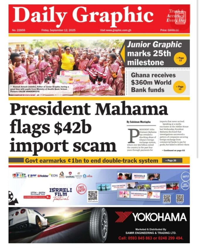 Newspaper headlines: Friday, September 12, 2025 Newspaper Headlines September 12, 2025 7:11 am - Share FacebookWhatsAppTwitterTelegramEmailPinterestPrint FacebookWhatsAppTwitterTelegramEmailPinterestPrint Previous article2025/26 GHPL MD1: Hearts of Oak host Hohoe United, Kotoko travel to ChelseaNext articleSouth Sudan vice-president charged with murder and treason TagsNewspaper headlines RELATED ARTICLES Local News Rice glut deepens as farmers struggle to sell last year’s harvest Local News Mahama unveils plan to turn prisons into hubs of agriculture and skill training International South Africa says it received distress calls from 17 citizens who joined mercenary forces fighting in Ukraine