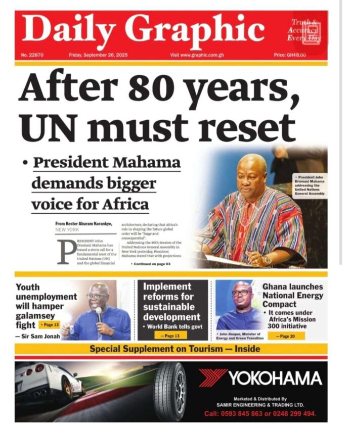Newspaper headlines: Friday, September 26, 2025 Newspaper Headlines September 26, 2025 7:11 am - Audio By Carbonatix FacebookWhatsAppTwitterTelegramEmailPinterestPrint Previous articleWorld Bank rejects Akufo-Addo gov’t’s Covid-19, Russia-Ukraine War defence for 2022 economic crisisNext articleReal banking is finally coming – AGI boss predicts lending rates will fall TagsNewspaper headlines RELATED ARTICLES Local News Republic Bank begins solar-powered borehole project at Taviefe SHS Politics Annoh-Dompreh demands Ministerial reshuffle as absences stall Parliament Local News Kpandai: Supreme Court’s decision to suspend rerun surprising but fair – Justice Abdullai