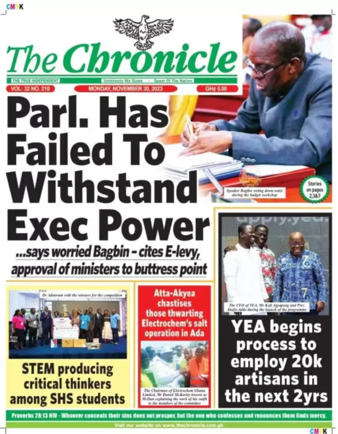 Newspaper headlines: Monday 20th November 2023 Newspaper Headlines November 20, 2023 6:51 am - Audio By Carbonatix FacebookWhatsAppTwitterTelegramEmailPinterestPrint Previous articleQueenmother appeals to Mahama to consider a running mate from Bono RegionNext article2024 election: NPP reacts to EIU, Fitch’s prediction TagsNewspaper headlines RELATED ARTICLES Local News Asantehene demands enforcement of law recognising Naba Azoka II as Bawku Chief Local News Government to issue position on Bawku peace mediation report within 24 hours Local News Bryan Acheampong says Bawumia is his biggest competitor in NPP race