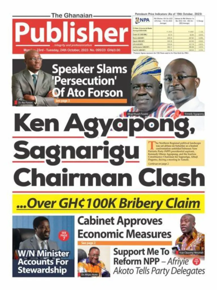 Newspaper headlines: Monday 23rd October 2023 Newspaper Headlines October 23, 2023 8:27 am - Audio By Carbonatix FacebookWhatsAppTwitterTelegramEmailPinterestPrint Previous articleHow to look stunning & turn heads without makeupNext articleMan ‘murdered’ on his farm at Agona Nyakrom Abrokro RELATED ARTICLES Newspaper Headlines Newspaper headlines: Monday, November 24, 2025 Newspaper Headlines Newspaper headlines: Friday, November 21, 2025 Newspaper Headlines Newspaper headlines: Thursday, November 20, 2025