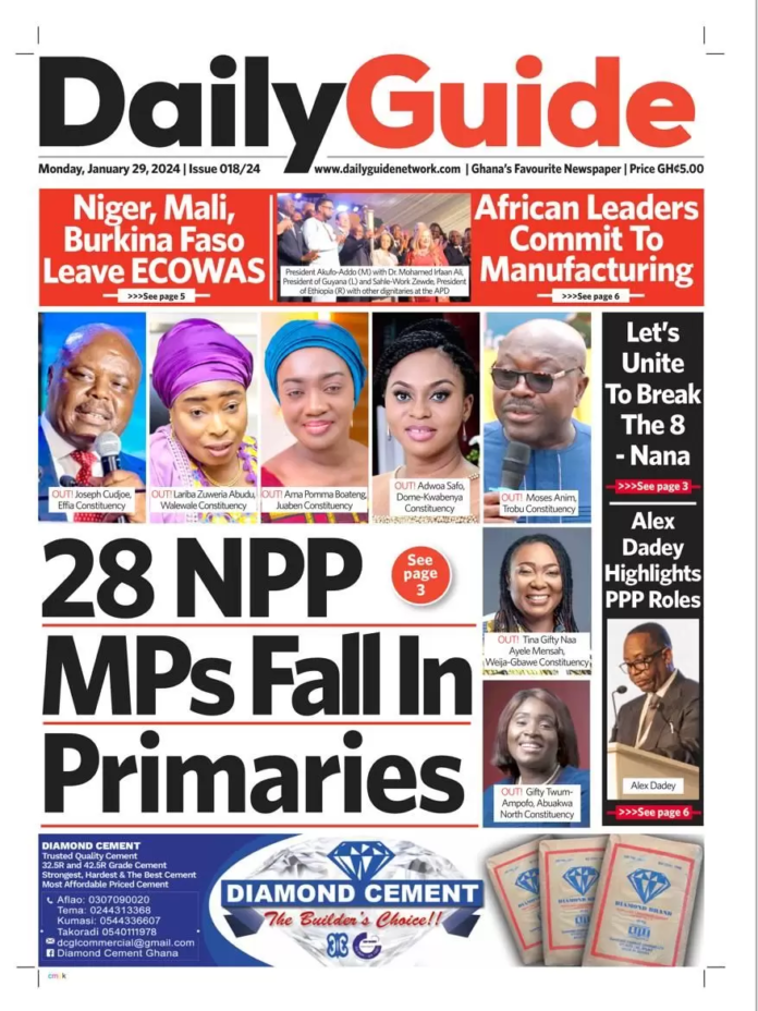Newspaper headlines: Monday 29th January 2024 Newspaper Headlines January 29, 2024 6:27 am - Audio By Carbonatix FacebookWhatsAppTwitterTelegramEmailPinterestPrint Previous articleNPP Youth Organiser attacks Chairman in church [Video]Next article#BlackExcellence: Strategies for Capital Access in the Global Economy TagsNewspaper headlines RELATED ARTICLES Local News Republic Bank begins solar-powered borehole project at Taviefe SHS Politics Annoh-Dompreh demands Ministerial reshuffle as absences stall Parliament Local News Kpandai: Supreme Court’s decision to suspend rerun surprising but fair – Justice Abdullai
