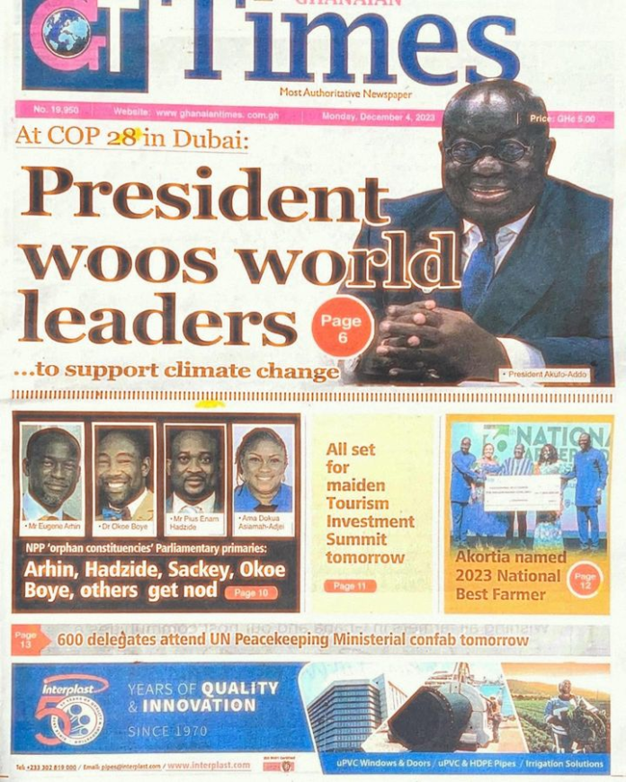 Newspaper headlines: Monday 4th December, 2023 Newspaper Headlines December 4, 2023 7:41 am - Audio By Carbonatix FacebookWhatsAppTwitterTelegramEmailPinterestPrint Previous articleNDC stalwart equips Volta secretariat ahead of 2024 electionsNext articleSHS 1 students to report to school today TagsNewspaper headlines RELATED ARTICLES News A Plus hails Speaker Bagbin’s stewardship, dismisses minor criticism Local News Greater Accra Regional Minister distributes streetlights to all 29 Assemblies Local News Nkwanta South MCE inspects ongoing school projects