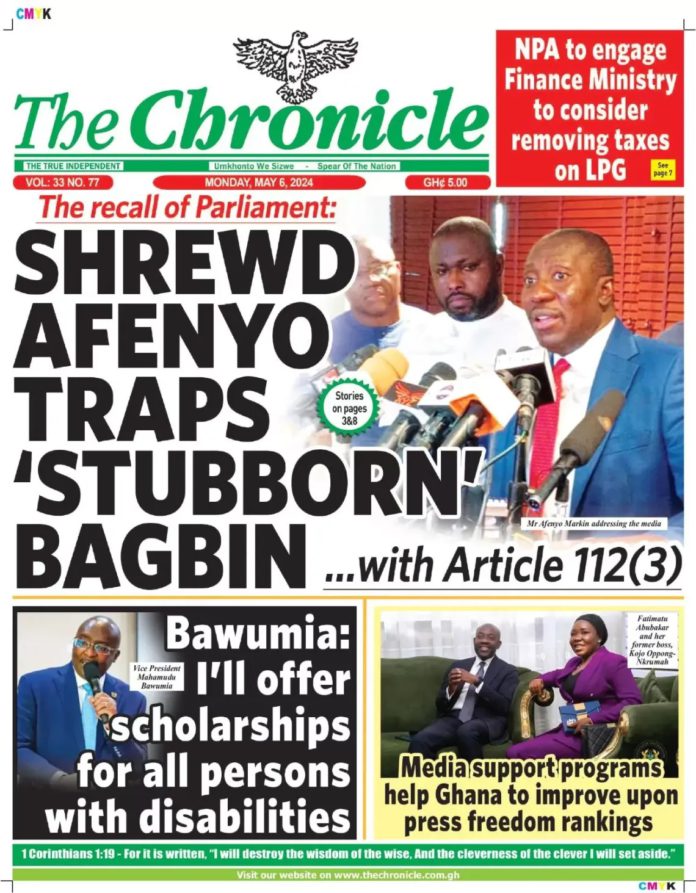 Newspaper headlines: Monday 6th May 2024 Newspaper Headlines May 6, 2024 6:38 am - Audio By Carbonatix FacebookWhatsAppTwitterTelegramEmailPinterestPrint Previous articleMadonna’s free Brazil concert attracts more than 1.6 million fansNext articleEnhancing African Oil Production: Grupo Simples Oil Joins African Energy Week (AEW) 2024 as Bronze Sponsor TagsNewspaper headlines RELATED ARTICLES Local News Republic Bank begins solar-powered borehole project at Taviefe SHS Politics Annoh-Dompreh demands Ministerial reshuffle as absences stall Parliament Local News Kpandai: Supreme Court’s decision to suspend rerun surprising but fair – Justice Abdullai