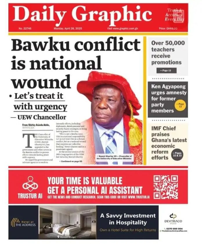 Newspaper headlines: Monday, April 28, 2025 Newspaper Headlines April 28, 2025 7:21 am - Audio By Carbonatix FacebookWhatsAppTwitterTelegramEmailPinterestPrint Previous articleGov’t surpasses Treasury Bill target by GH¢550mNext articleThere is a need to reclaim the soul of NPP – Nyaho-Nyaho Tamakloe TagsNewspaper headlines RELATED ARTICLES Local News Minority calls for Lands Minister’s removal over withdrawn Lithium Agreement Entertainment I’m divorced – Nana Ama Mcbrown reveals Local News Obuasi Police arrest 40 suspects in coordinated anti-crime operations