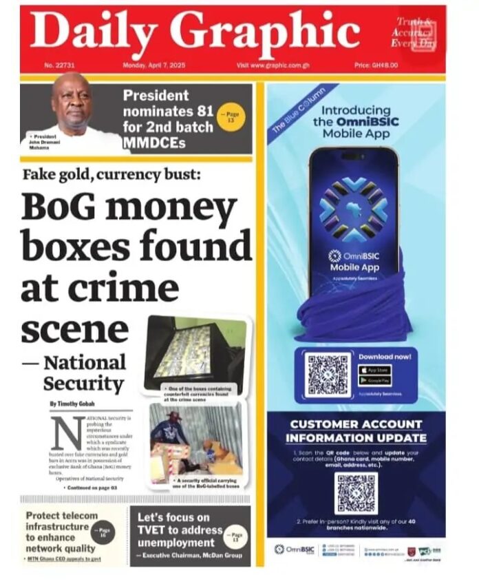 Newspaper headlines: Monday, April 7, 2025 Newspaper Headlines April 7, 2025 7:04 am - Audio By Carbonatix FacebookWhatsAppTwitterTelegramEmailPinterestPrint Previous articleCAPHA commends government’s bold nutrition commitments, urges swift actionNext articleSkin disease outbreak leaves Mepe-Avetakpo residents in agony TagsNewspaper headlines RELATED ARTICLES Local News Minority calls for Lands Minister’s removal over withdrawn Lithium Agreement Entertainment I’m divorced – Nana Ama Mcbrown reveals Local News Obuasi Police arrest 40 suspects in coordinated anti-crime operations
