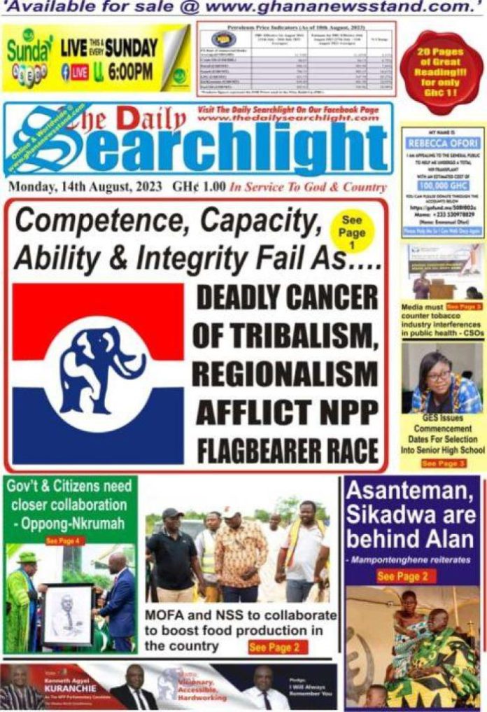 Newspaper Headlines: Monday, August 14, 2023 Newspaper Headlines August 14, 2023 7:35 am - Audio By Carbonatix FacebookWhatsAppTwitterTelegramEmailPinterestPrint Previous articleCompassion International Ghana to launch maiden learning seriesNext articlePL:Â Disasi earns point for Chelsea against Liverpool RELATED ARTICLES Newspaper Headlines Newspaper headlines: Monday, November 24, 2025 Newspaper Headlines Newspaper headlines: Friday, November 21, 2025 Newspaper Headlines Newspaper headlines: Thursday, November 20, 2025