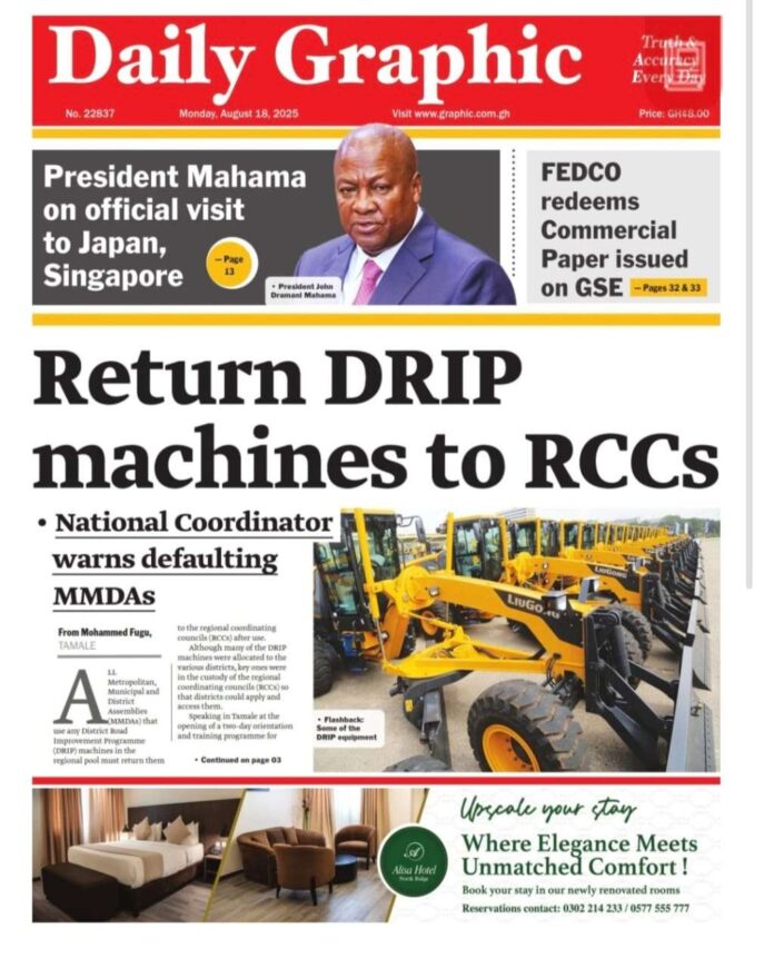 Newspaper headlines: Monday, August 18, 2025 Newspaper Headlines August 18, 2025 7:32 am - Audio By Carbonatix FacebookWhatsAppTwitterTelegramEmailPinterestPrint Previous articleMahama embarks on official visits to Japan and SingaporeNext articleAttorney General rejects international calls for reinstatement of suspended CJ TagsNewspaper headlines RELATED ARTICLES News Police arrest two suspects over viral child abuse video at Agona Jamasi Local News Asantehene demands enforcement of law recognising Naba Azoka II as Bawku Chief Local News Government to issue position on Bawku peace mediation report within 24 hours