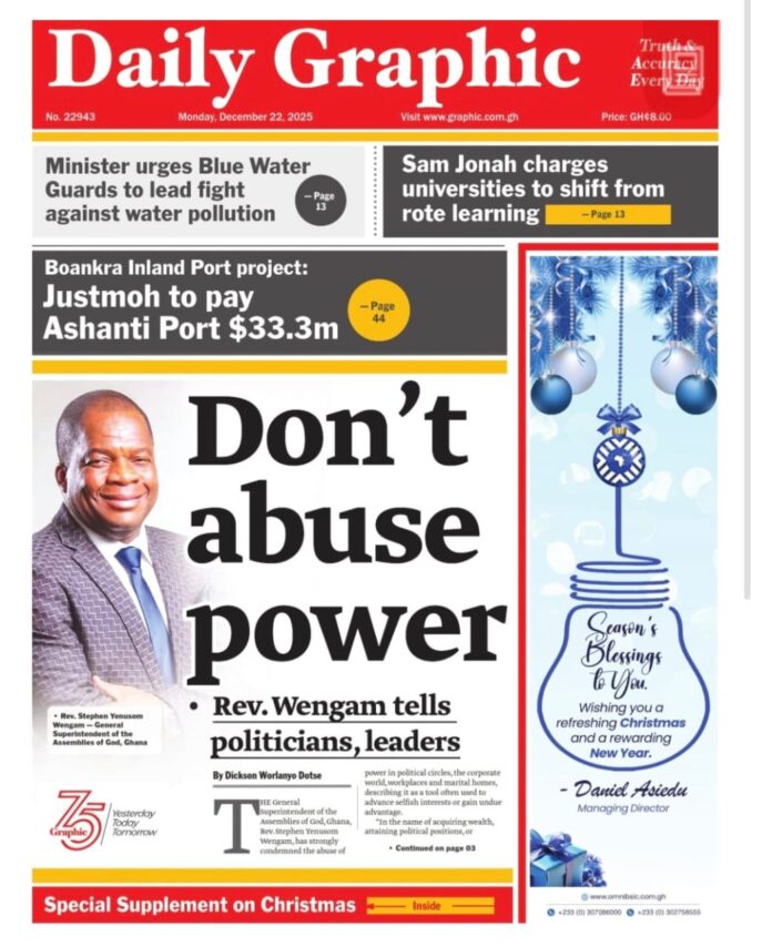 Newspaper headlines: Monday, December 22, 2025 Newspaper Headlines December 22, 2025 7:52 am - Audio By Carbonatix Here are the front pages of some of Ghana’s newspapers today. FacebookWhatsAppTwitterTelegramEmailPinterestPrint Previous articleLands Minister commissions 3rd batch of 636 Blue Water Guards; pledges sustained fight against galamseyNext articleIt was love at first sight – John Kumah’s widow on how she met new husband TagsNewspaper headlines RELATED ARTICLES International Russian general killed by car bomb in Moscow, officials say Local News Dafeamakpor defends withdrawal of OSP repeal bill Local News Six, including three-month-old baby, killed in house fire at Abuakwa Manhyia