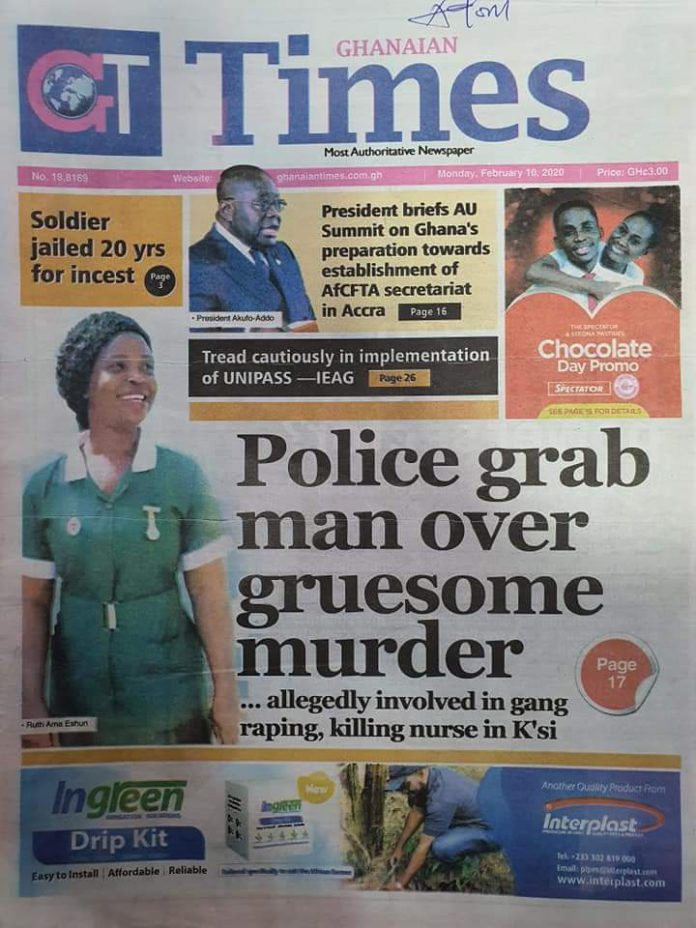 Newspaper Headlines: Monday, February 10, 2020 Newspaper HeadlinesUncategorized February 10, 2020 6:36 am - Audio By Carbonatix FacebookWhatsAppTwitterTelegramEmailPinterestPrint Previous articleCyber Security Law to be passed by June – Communications MinisterNext articleFarmer kills wife and shoots himself at Pieso RELATED ARTICLES Newspaper Headlines Newspaper headlines: Monday, November 24, 2025 Newspaper Headlines Newspaper headlines: Friday, November 21, 2025 Newspaper Headlines Newspaper headlines: Thursday, November 20, 2025