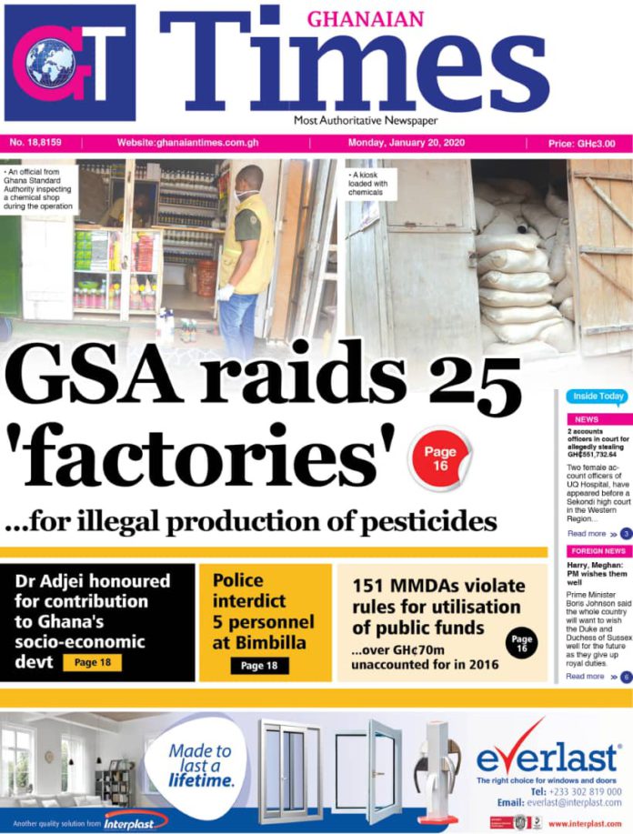 Newspaper Headlines: Monday, January 20, 2020 Newspaper HeadlinesUncategorized January 20, 2020 6:56 am - Audio By Carbonatix FacebookWhatsAppTwitterTelegramEmailPinterestPrint Previous articleComme Des Garçons: Row over white fashion models’ cornrow wigsNext article5 police officers interdicted for assaulting a driver RELATED ARTICLES Newspaper Headlines Newspaper headlines: Monday, November 24, 2025 Newspaper Headlines Newspaper headlines: Friday, November 21, 2025 Newspaper Headlines Newspaper headlines: Thursday, November 20, 2025