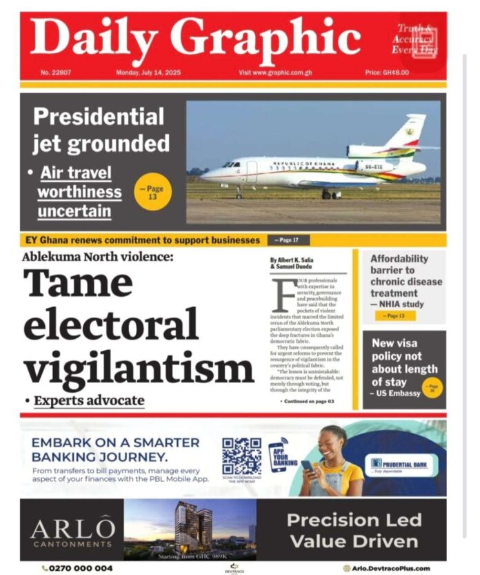 Newspaper headlines: Monday, July 14, 2025 Newspaper Headlines July 14, 2025 8:03 am - Audio By Carbonatix FacebookWhatsAppTwitterTelegramEmailPinterestPrint Previous articleMahama taps US-trained surgeon as Deputy Health Minister: Prof. Ayensu-Danquah brings decades of international expertise to healthcare roleNext articleCourt remands man over police death threat video TagsNewspaper headlines RELATED ARTICLES Local News Asantehene demands enforcement of law recognising Naba Azoka II as Bawku Chief Local News Government to issue position on Bawku peace mediation report within 24 hours Local News Bryan Acheampong says Bawumia is his biggest competitor in NPP race