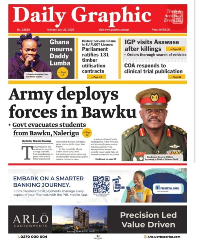 Newspaper headlines: Monday, July 28, 2025 Newspaper Headlines July 28, 2025 6:51 am - Audio By Carbonatix FacebookWhatsAppTwitterTelegramEmailPinterestPrint Previous articleGov’t releases funds for 2025 WASSCE practical examsNext articleAntoine Semenyo targets stronger season with Bournemouth TagsNewspaper headlines RELATED ARTICLES Local News NPP denies involvement in bee attack on NDC supporters Local News Bee Attack: NPP allegedly brought three mallams from Niger to Kpandai – Mustapha Gbande Local News Supreme Court will dismiss Kpandai case; it lacks merit – Tanko Computer