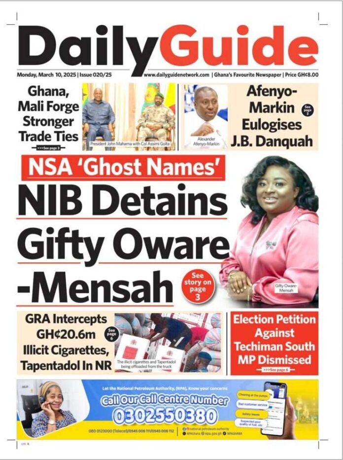 Newspaper headlines: Monday, March 10, 2025 Newspaper HeadlinesNews March 10, 2025 8:42 am - Audio By Carbonatix FacebookWhatsAppTwitterTelegramEmailPinterestPrint Previous articleMahama, IGP urged to resolve dispute at Manya Yoyim, AdjenaNext articleProf. Adei advocates for establishment of corruption courts TagsNewspaper headlines RELATED ARTICLES Local News Gov’t backs Asantehene’s Bawku Mediation Report, launches GH¢1bn revitalisation fund Local News Volta must retain its role as Ghana’s ‘Oxygen’ – Mahama Local News UK and Ghana co-host African Development Fund 17 Pledge Conference in London