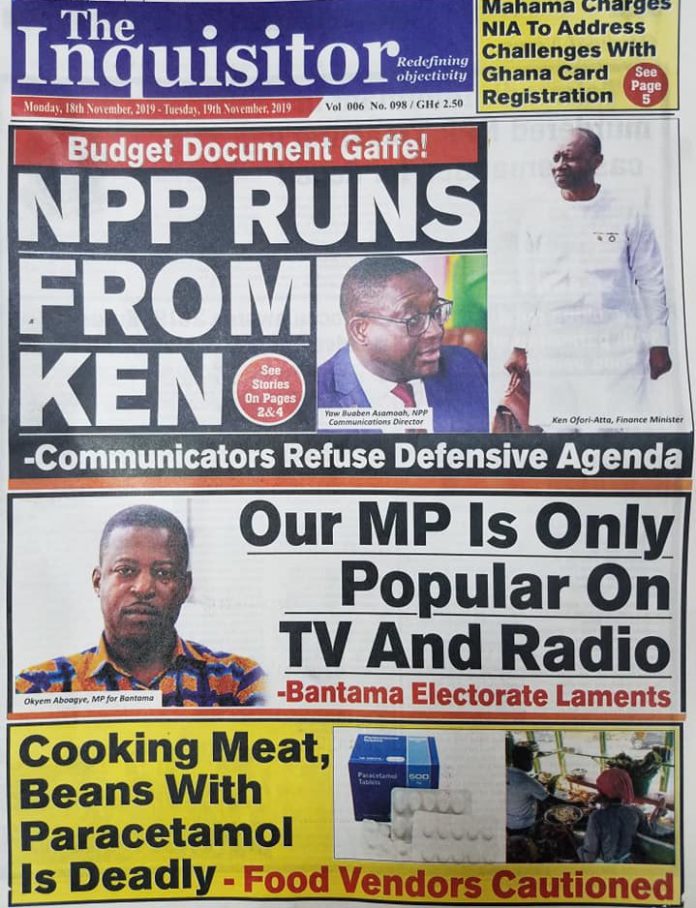 Newspaper Headlines: Monday, November 18, 2019 Newspaper HeadlinesUncategorized November 18, 2019 6:46 am - Audio By Carbonatix FacebookWhatsAppTwitterTelegramEmailPinterestPrint Previous articleFrom Agbogbloshie slum to Ghana’s premier medical school; the story of Dr. Olivia AgbenyekeNext article1D1F: Pineapple juice from Ekumfi factory now on sale RELATED ARTICLES Newspaper Headlines Newspaper headlines: Monday, November 24, 2025 Newspaper Headlines Newspaper headlines: Friday, November 21, 2025 Newspaper Headlines Newspaper headlines: Thursday, November 20, 2025