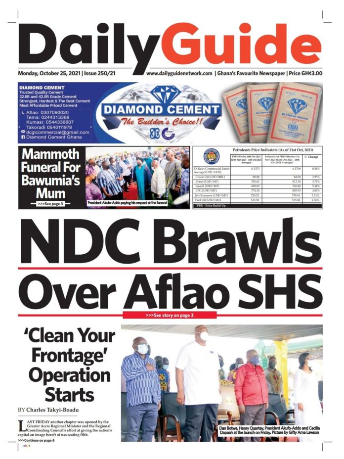 Newspaper Headlines: Monday, October 25, 2021 Newspaper Headlines October 25, 2021 6:30 am - Audio By Carbonatix FacebookWhatsAppTwitterTelegramEmailPinterestPrint Previous articleSpectacular and Elusive Bird rediscovered in Atewa ForestNext article3 in police custody for faking kidnapping incident in Takoradi RELATED ARTICLES Newspaper Headlines Newspaper headlines: Monday, November 24, 2025 Newspaper Headlines Newspaper headlines: Friday, November 21, 2025 Newspaper Headlines Newspaper headlines: Thursday, November 20, 2025