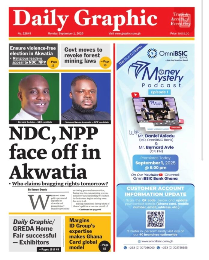 Newspaper headlines: Monday, September 1, 2025 Newspaper Headlines September 1, 2025 6:59 am - Audio By Carbonatix FacebookWhatsAppTwitterTelegramEmailPinterestPrint Previous article12 aspirants cleared for Tamale Central NDC primaries on September 6Next articleErik ten Hag sacked by Bayer Leverkusen after just two Bundesliga games TagsNewspaper headlines RELATED ARTICLES Local News Asantehene demands enforcement of law recognising Naba Azoka II as Bawku Chief Local News Government to issue position on Bawku peace mediation report within 24 hours Local News Bryan Acheampong says Bawumia is his biggest competitor in NPP race