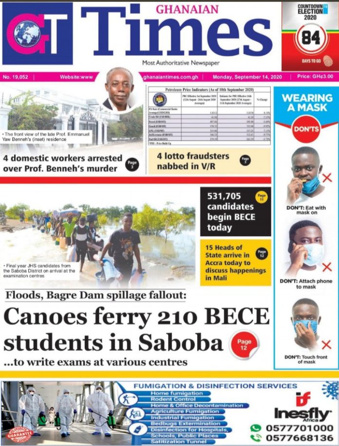 Newspaper Headlines: Monday, September 14, 2020 Newspaper Headlines September 14, 2020 7:51 am - Audio By Carbonatix FacebookWhatsAppTwitterTelegramEmailPinterestPrint Previous articleFree SHS: No serious manifesto will scrap double-track – Kweku Baako criticizes NDC manifestoNext articleNABCo beneficiaries will be made permanent staff – NDC pledges RELATED ARTICLES Newspaper Headlines Newspaper headlines: Monday, November 24, 2025 Newspaper Headlines Newspaper headlines: Friday, November 21, 2025 Newspaper Headlines Newspaper headlines: Thursday, November 20, 2025