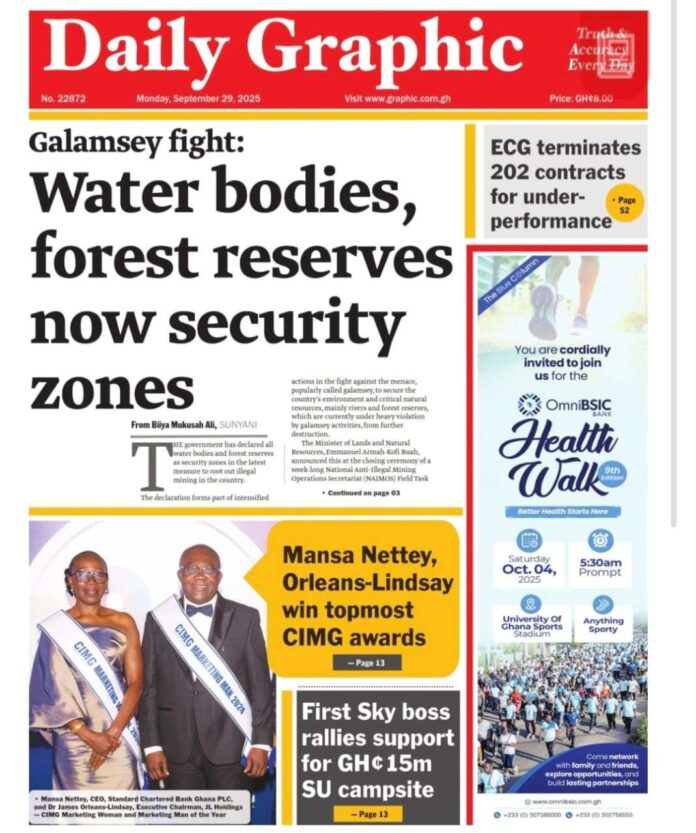 Newspaper headlines: Monday, September 29, 2025 Newspaper Headlines September 29, 2025 7:13 am - Audio By Carbonatix FacebookWhatsAppTwitterTelegramEmailPinterestPrint Previous articleHow smelly shoes inspired India’s Ig Nobel prize-winning studyNext articleIMANI demands audit as forensic report exposes Gold-for-Oil scandal TagsNewspaper headlines RELATED ARTICLES News GNFS trains fire volunteers in Tolon District to boost community fire safety Entertainment TikToker Peller arrested for reckless driving during livestream News Police arrest two suspects over viral child abuse video at Agona Jamasi