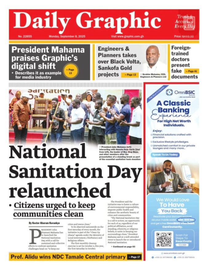 Newspaper headlines: Monday, September 8, 2025 Newspaper Headlines September 8, 2025 7:15 am - Audio By Carbonatix FacebookWhatsAppTwitterTelegramEmailPinterestPrint Previous articleIMF Staff Mission expected in Ghana at end of September for 5th Programme ReviewNext articleAmedzofe opens 2 sacred sites to tourism traffic TagsNewspaper headlines RELATED ARTICLES Local News Minority calls for Lands Minister’s removal over withdrawn Lithium Agreement Entertainment I’m divorced – Nana Ama Mcbrown reveals Local News Obuasi Police arrest 40 suspects in coordinated anti-crime operations