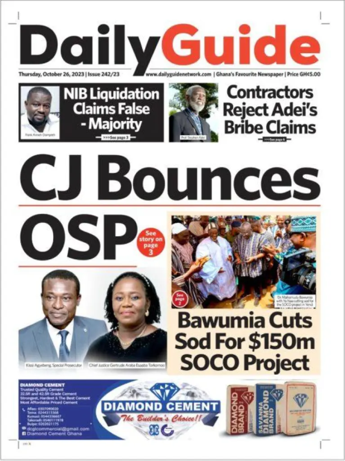 Newspaper headlines: Thursday 26th October 2023 Newspaper Headlines October 26, 2023 8:02 am - Audio By Carbonatix FacebookWhatsAppTwitterTelegramEmailPinterestPrint Previous articleFIFA statementNext articleAkosombo Dam Spillage: Don’t disenfranchise affected residents in 2024 elections – Retired judge RELATED ARTICLES Newspaper Headlines Newspaper headlines: Monday, November 24, 2025 Newspaper Headlines Newspaper headlines: Friday, November 21, 2025 Newspaper Headlines Newspaper headlines: Thursday, November 20, 2025