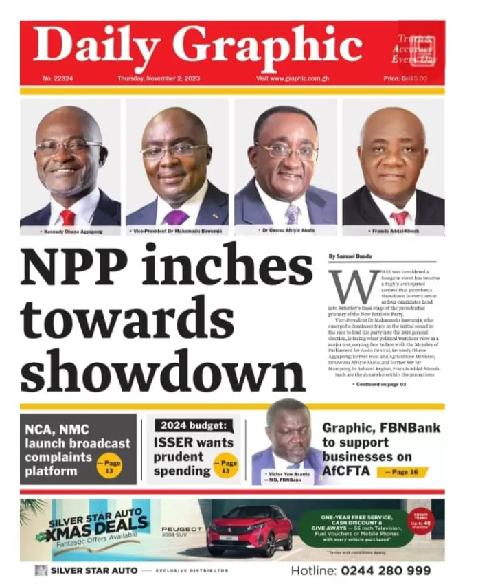 Newspaper headlines: Thursday 2nd November 2023 Newspaper Headlines November 2, 2023 7:06 am - Audio By Carbonatix FacebookWhatsAppTwitterTelegramEmailPinterestPrint Previous articleSuperb Newcastle knock holders Man Utd out of EFL CupNext articleNPP presidential race: Money won’t determine the winner – Justin Kodua TagsNewspaper headlines RELATED ARTICLES Local News NPP denies involvement in bee attack on NDC supporters Local News Bee Attack: NPP allegedly brought three mallams from Niger to Kpandai – Mustapha Gbande Local News Supreme Court will dismiss Kpandai case; it lacks merit – Tanko Computer