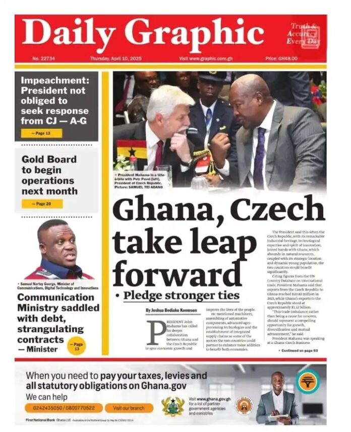 Newspaper headlines: Thursday, April 10, 2025 Newspaper Headlines April 10, 2025 9:25 am - Audio By Carbonatix FacebookWhatsAppTwitterTelegramEmailPinterestPrint Previous articleMinority petitions Speaker Bagbin over NIB’s attempt to arrest Ntim FordjourNext articleOnana ‘one of United’s worst goalkeepers’ – Matic TagsNewspaper headlines RELATED ARTICLES Local News Asantehene demands enforcement of law recognising Naba Azoka II as Bawku Chief Local News Government to issue position on Bawku peace mediation report within 24 hours Local News Bryan Acheampong says Bawumia is his biggest competitor in NPP race