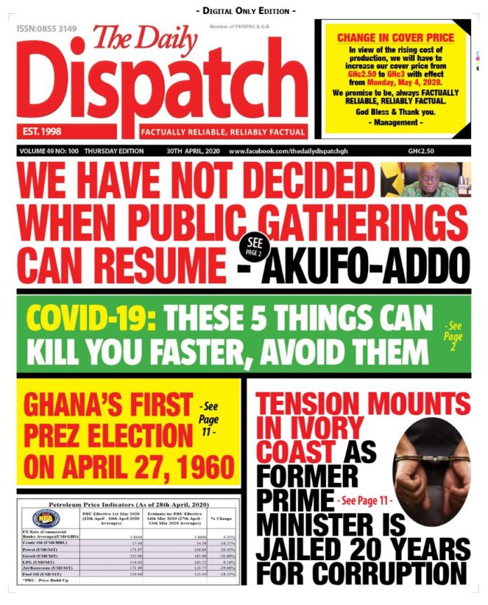 Newspaper Headlines: Thursday, April 30, 2020 SourceAdomonline.com Newspaper Headlines April 30, 2020 6:31 am - Audio By Carbonatix FacebookWhatsAppTwitterTelegramEmailPinterestPrint Previous articleTop Manhattan ER doctor commits suicide, shaken by coronavirus onslaughtNext article20 Burkinabés arrested after entering Ghana illegally RELATED ARTICLES Newspaper Headlines Newspaper headlines: Monday, November 24, 2025 Newspaper Headlines Newspaper headlines: Friday, November 21, 2025 Newspaper Headlines Newspaper headlines: Thursday, November 20, 2025
