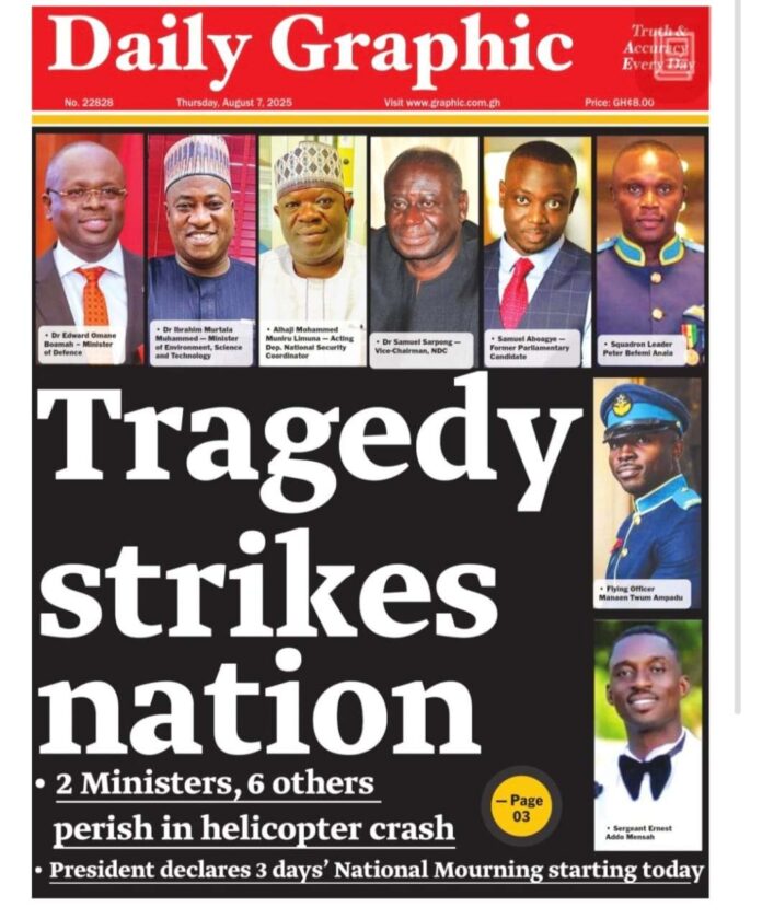 Newspaper headlines: Thursday, August 7, 2025 Newspaper Headlines August 7, 2025 9:14 am - Audio By Carbonatix FacebookWhatsAppTwitterTelegramEmailPinterestPrint Previous articleECOWAS mourns tragic loss of victims in helicopter crashNext articleKenyan President William Ruto expresses condolences to Ghana over deadly helicopter crash TagsNewspaper headlines RELATED ARTICLES Local News Asantehene demands enforcement of law recognising Naba Azoka II as Bawku Chief Local News Government to issue position on Bawku peace mediation report within 24 hours Local News Bryan Acheampong says Bawumia is his biggest competitor in NPP race