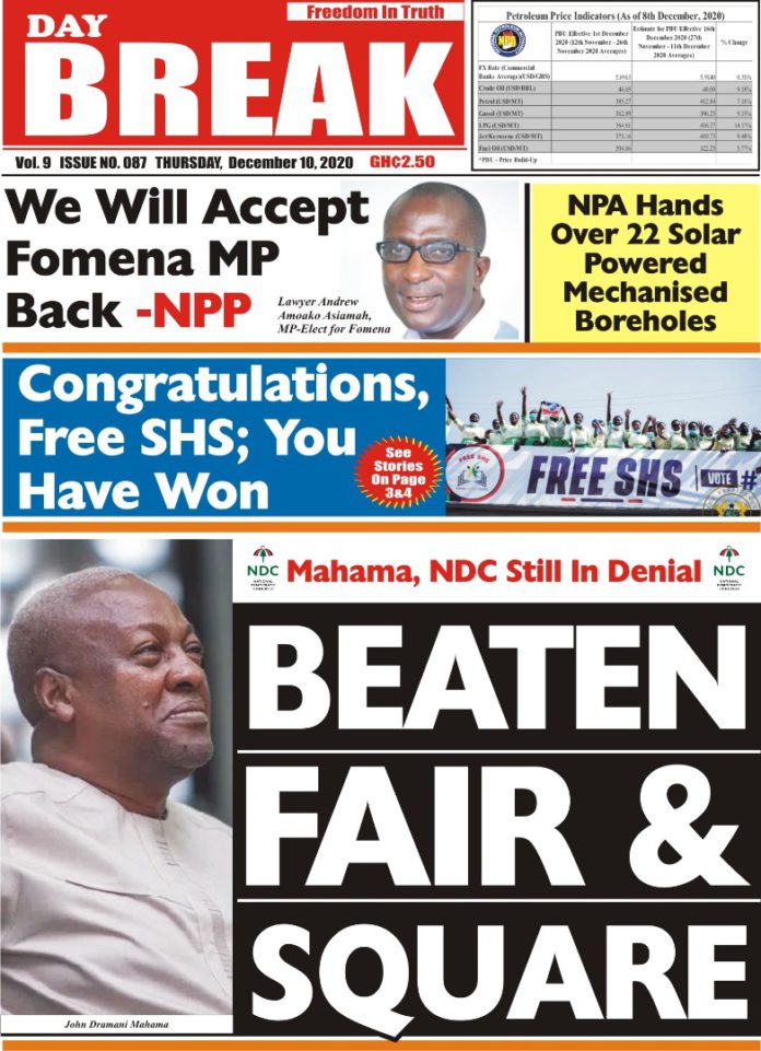 Newspaper Headlines: Thursday, December 10, 2020 Newspaper Headlines December 10, 2020 7:07 am - Audio By Carbonatix FacebookWhatsAppTwitterTelegramEmailPinterestPrint Previous articleElection 2020: NDC rejects presidential resultsNext articleAccident on North Airport road leaves several injured RELATED ARTICLES Newspaper Headlines Newspaper headlines: Monday, November 24, 2025 Newspaper Headlines Newspaper headlines: Friday, November 21, 2025 Newspaper Headlines Newspaper headlines: Thursday, November 20, 2025