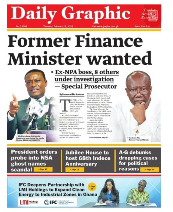 Newspaper headlines: Thursday, February 13, 2025 Newspaper Headlines February 13, 2025 8:52 am - Audio By Carbonatix FacebookWhatsAppTwitterTelegramEmailPinterestPrint Previous articleTwo arrested for stabbing ‘Okada’ rider to death at Agona Okoto-KwaaNext articleMinority demands answers from National Security Coordinator over raid in Ofori-Atta’s home TagsNewspaper headlines RELATED ARTICLES Local News Minority calls for Lands Minister’s removal over withdrawn Lithium Agreement Entertainment I’m divorced – Nana Ama Mcbrown reveals Local News Obuasi Police arrest 40 suspects in coordinated anti-crime operations