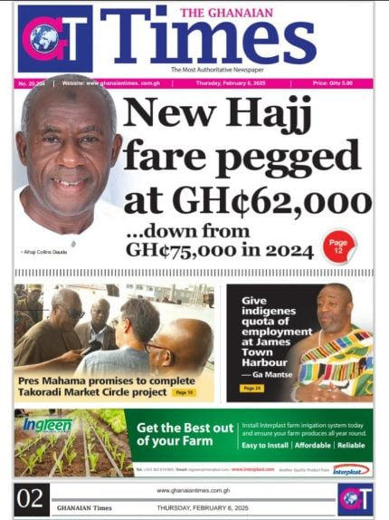 Newspaper headlines: Thursday, February 6, 2025 Newspaper Headlines February 6, 2025 8:29 am - Audio By Carbonatix FacebookWhatsAppTwitterTelegramEmailPinterestPrint Previous articleNollywood actress passes on aged 35Next articleJohnson Asiamah uniquely qualified to hold BoG Governor position – Kwakye Ofosu TagsNewspaper headlines RELATED ARTICLES Local News Republic Bank begins solar-powered borehole project at Taviefe SHS Politics Annoh-Dompreh demands Ministerial reshuffle as absences stall Parliament Local News Kpandai: Supreme Court’s decision to suspend rerun surprising but fair – Justice Abdullai