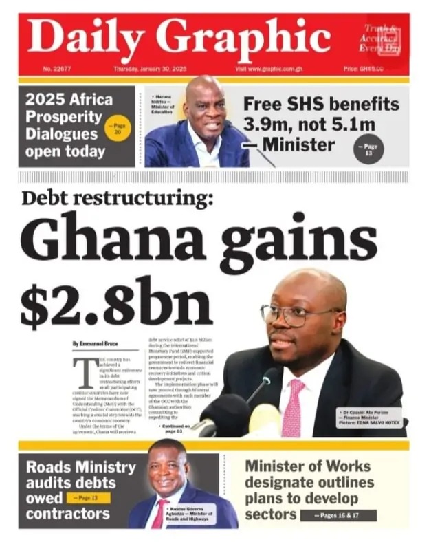 Newspaper headlines: Thursday, January 30, 2025 Newspaper Headlines January 30, 2025 7:15 am - Audio By Carbonatix FacebookWhatsAppTwitterTelegramEmailPinterestPrint Previous articleIt will be difficult to beat Hearts of Oak – Heart of Lions assistant coachNext articleIbrahim Tanko targets trophies as new Medeama SC head coach TagsNewspaper headlines RELATED ARTICLES Local News Kpandai: Supreme Court’s decision to suspend rerun surprising but fair – Justice Abdullai Entertainment GTA’s Kofi Atta Kakra Kusi weds Sharon Danquah in grand ceremony Local News Rev. Wengam leads Assemblies of God delegation to congratulate Chief of Defence Staff