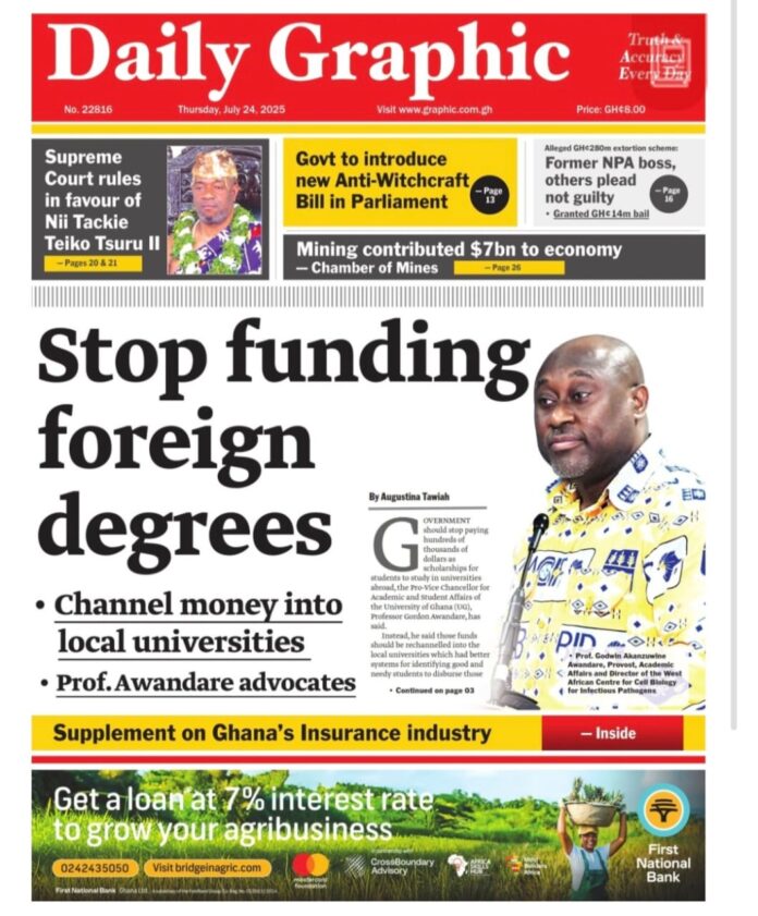 Newspaper headlines: Thursday, July 24, 2025 Newspaper Headlines July 24, 2025 8:22 am - Audio By Carbonatix FacebookWhatsAppTwitterTelegramEmailPinterestPrint Previous articleNPP can only win Akwatia by-election with Ama Sey – Some constituentsNext article‘Taxpayers will pay for it’ – Dr Seddoh on 60% recovery threshold in banking crisis TagsNewspaper headlines RELATED ARTICLES Local News Asantehene demands enforcement of law recognising Naba Azoka II as Bawku Chief Local News Government to issue position on Bawku peace mediation report within 24 hours Local News Bryan Acheampong says Bawumia is his biggest competitor in NPP race