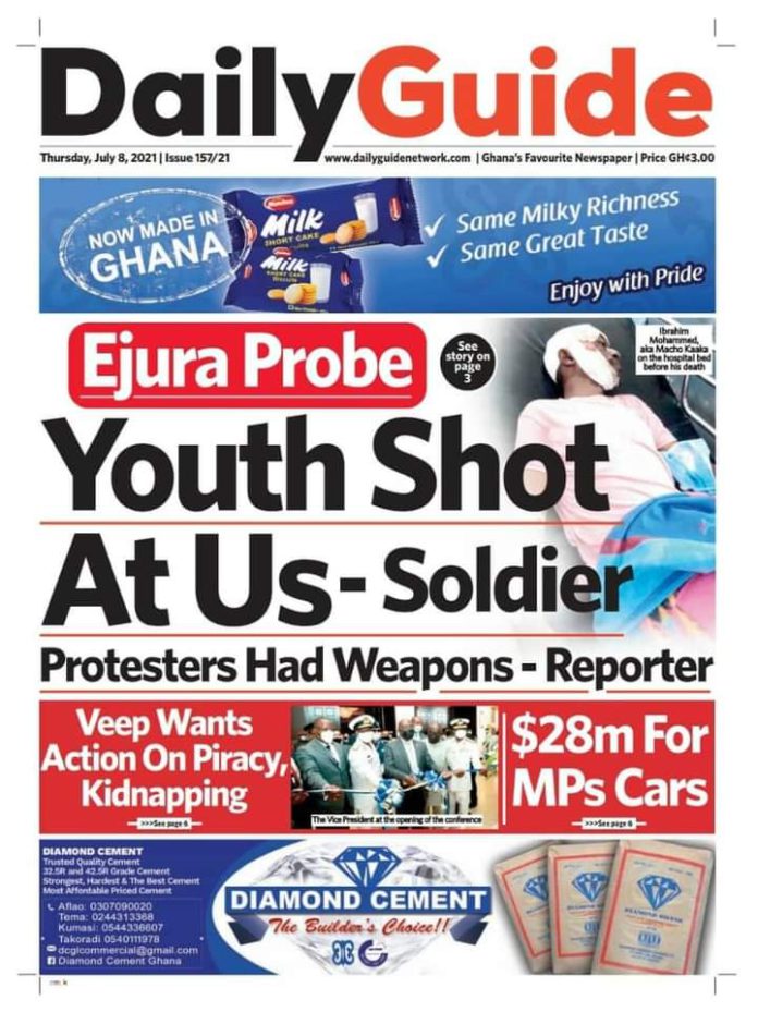 Newspaper Headlines: Thursday, July 8, 2021 Newspaper Headlines July 8, 2021 7:50 am - Audio By Carbonatix FacebookWhatsAppTwitterTelegramEmailPinterestPrint Previous articleSoldiers who beat civilians at Wa in troubleNext article3.1 million Ghanaians have mental disorders – Health Minister RELATED ARTICLES Newspaper Headlines Newspaper headlines: Monday, November 24, 2025 Newspaper Headlines Newspaper headlines: Friday, November 21, 2025 Newspaper Headlines Newspaper headlines: Thursday, November 20, 2025
