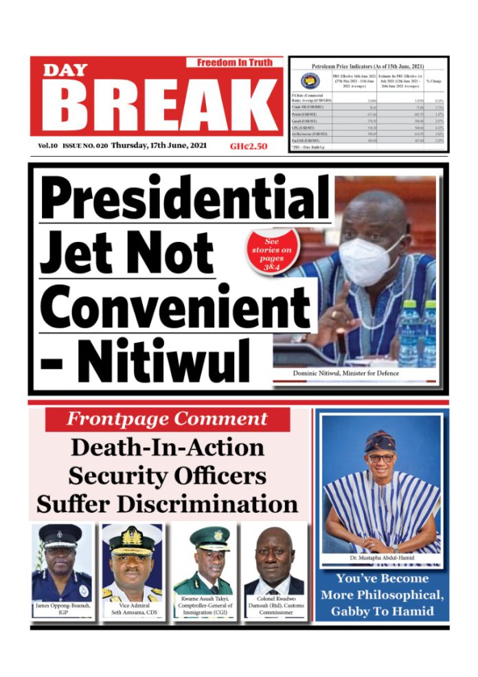Newspaper Headlines: Thursday, June 17, 2021 Newspaper Headlines June 17, 2021 7:44 am - Audio By Carbonatix FacebookWhatsAppTwitterTelegramEmailPinterestPrint Previous articlePapers for 2020 WASSCE were leaked – Africa Education WatchNext articleMurder of wife of GNPC boss’ driver: Police requests CCTV footage RELATED ARTICLES Newspaper Headlines Newspaper headlines: Monday, November 24, 2025 Newspaper Headlines Newspaper headlines: Friday, November 21, 2025 Newspaper Headlines Newspaper headlines: Thursday, November 20, 2025