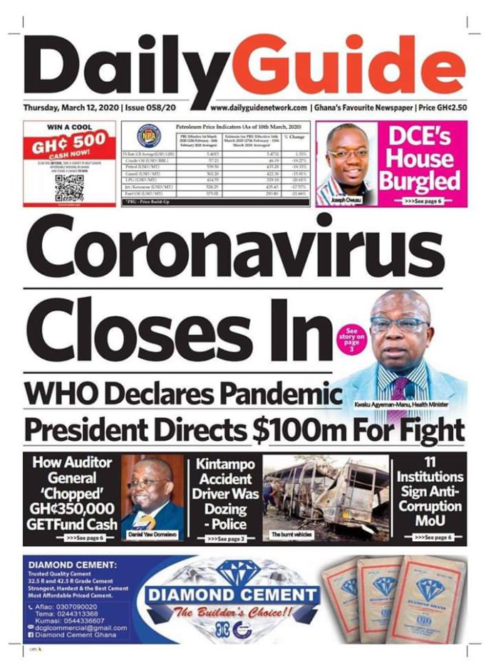 Newspaper Headlines: Thursday, March 12, 2020 Newspaper HeadlinesUncategorized March 12, 2020 6:24 am - Audio By Carbonatix FacebookWhatsAppTwitterTelegramEmailPinterestPrint Previous articleKojo Antwi urges musicians to compose good songsNext articleDi Asa’s PM exposes notorious men RELATED ARTICLES Newspaper Headlines Newspaper headlines: Monday, November 24, 2025 Newspaper Headlines Newspaper headlines: Friday, November 21, 2025 Newspaper Headlines Newspaper headlines: Thursday, November 20, 2025