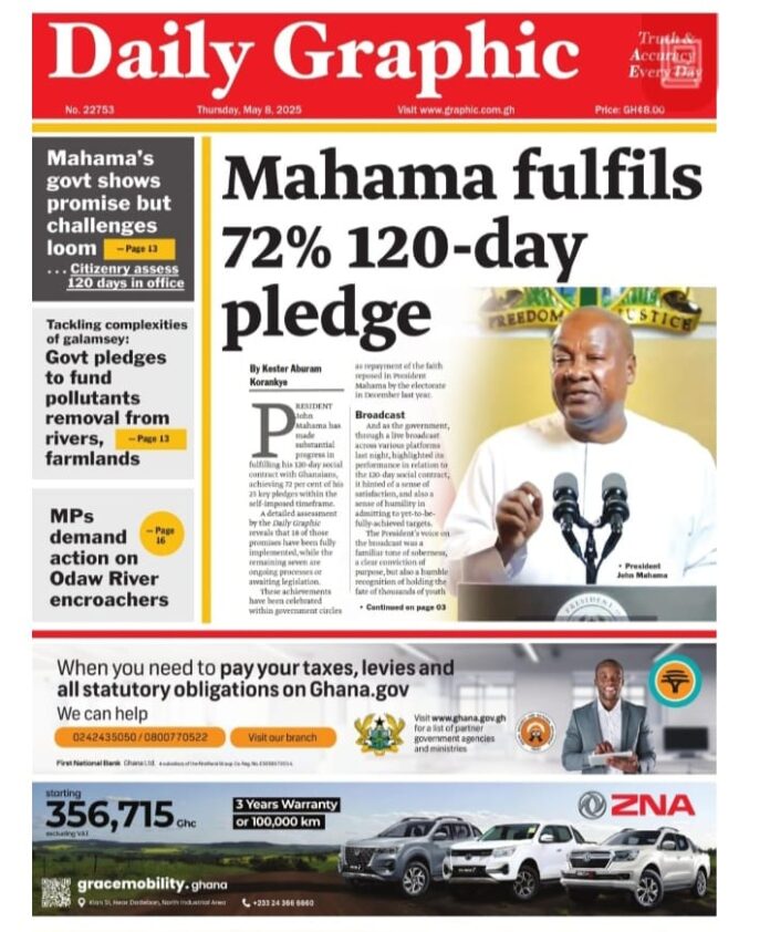 Newspaper headlines: Thursday, May 8, 2025 Newspaper Headlines May 8, 2025 7:19 am - Audio By Carbonatix FacebookWhatsAppTwitterTelegramEmailPinterestPrint Previous articleSchool Feeding caterers protest contract termination, demand compensationNext articleAdu-Boahene claims GH₵8.3m was spent on ‘opposition party’ ahead of 2024 election TagsNewspaper headlines RELATED ARTICLES Africa Ghana deploys Armed Forces to aid Jamaica after hurricane Local News Residents praise President Mahama for launching Ho Municipal Oxygen City Project Local News Minority calls for Lands Minister’s removal over withdrawn Lithium Agreement