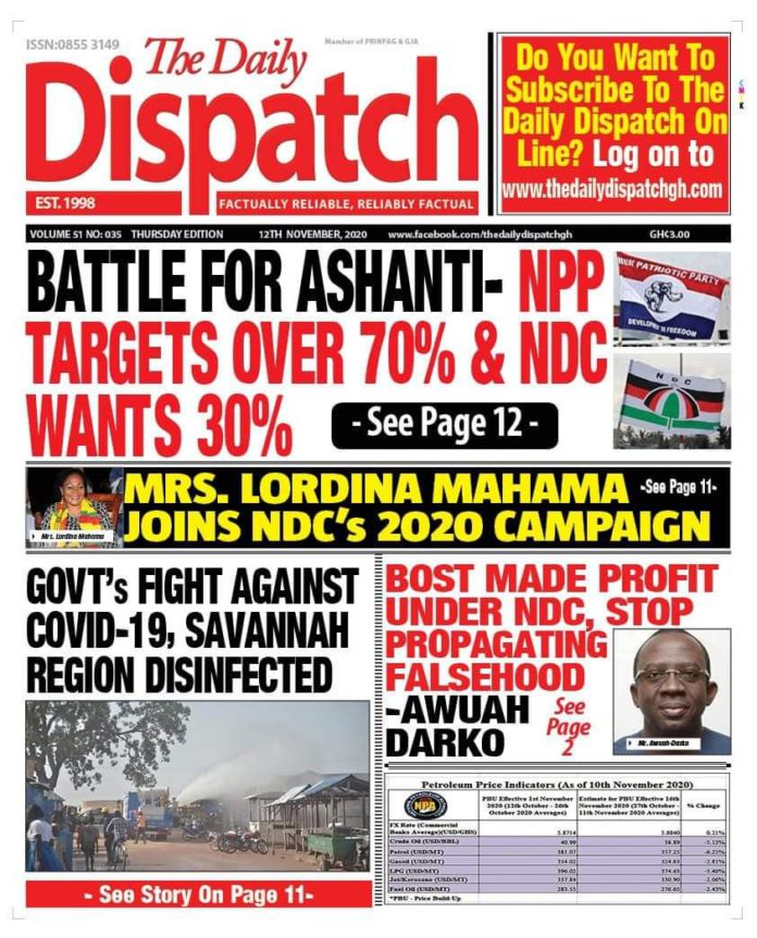 Newspaper Headlines: Thursday, November 12, 2020 Newspaper Headlines November 12, 2020 7:00 am - Audio By Carbonatix FacebookWhatsAppTwitterTelegramEmailPinterestPrint Previous articleI don’t miss Stonebwoy, I’m not sure he misses me either – Kelvyn BoyNext articleI took Manasseh as my son, I never knew he could do this to me – Sacked PPA boss RELATED ARTICLES Newspaper Headlines Newspaper headlines: Monday, November 24, 2025 Newspaper Headlines Newspaper headlines: Friday, November 21, 2025 Newspaper Headlines Newspaper headlines: Thursday, November 20, 2025