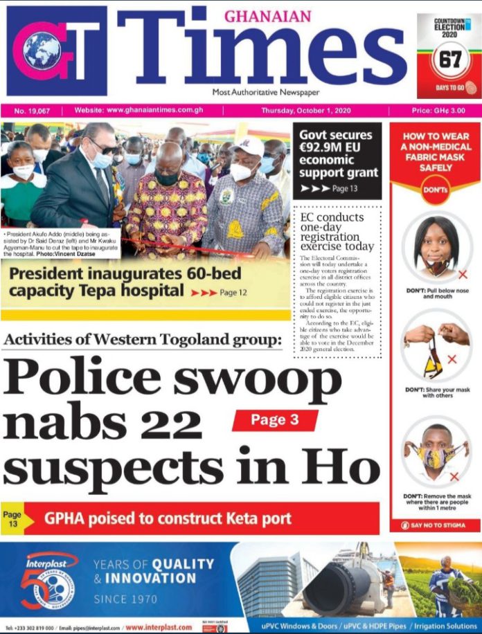 Newspaper Headlines: Thursday, October 1, 2020 Newspaper Headlines October 1, 2020 6:49 am - Audio By Carbonatix FacebookWhatsAppTwitterTelegramEmailPinterestPrint Previous articleMeet Kumawood actress Ellen White’s lookalike sisterNext articleGovernment has installed free Wifi in 80% of Senior High Schools – Bawumia RELATED ARTICLES Newspaper Headlines Newspaper headlines: Monday, November 24, 2025 Newspaper Headlines Newspaper headlines: Friday, November 21, 2025 Newspaper Headlines Newspaper headlines: Thursday, November 20, 2025