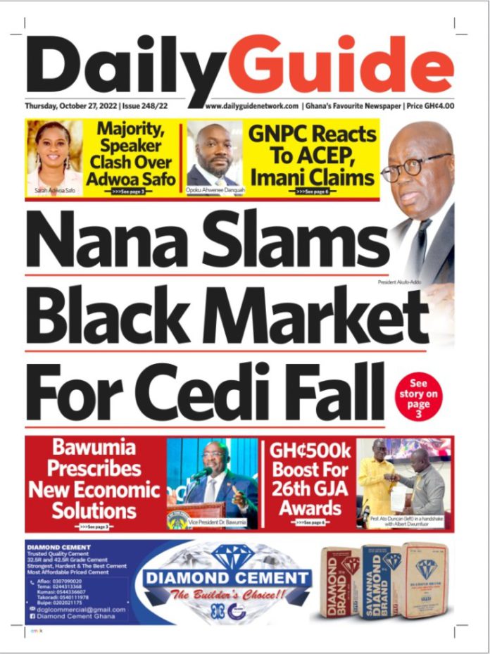 Newspaper Headlines: Thursday, October 27, 2022 Newspaper Headlines October 27, 2022 7:40 am - Audio By Carbonatix FacebookWhatsAppTwitterTelegramEmailPinterestPrint Previous articleCL: Barcelona exit Champions League as Inter progressNext articleCL: Atletico Madrid out after dramatic draw with Leverkusen RELATED ARTICLES Newspaper Headlines Newspaper headlines: Monday, November 24, 2025 Newspaper Headlines Newspaper headlines: Friday, November 21, 2025 Newspaper Headlines Newspaper headlines: Thursday, November 20, 2025