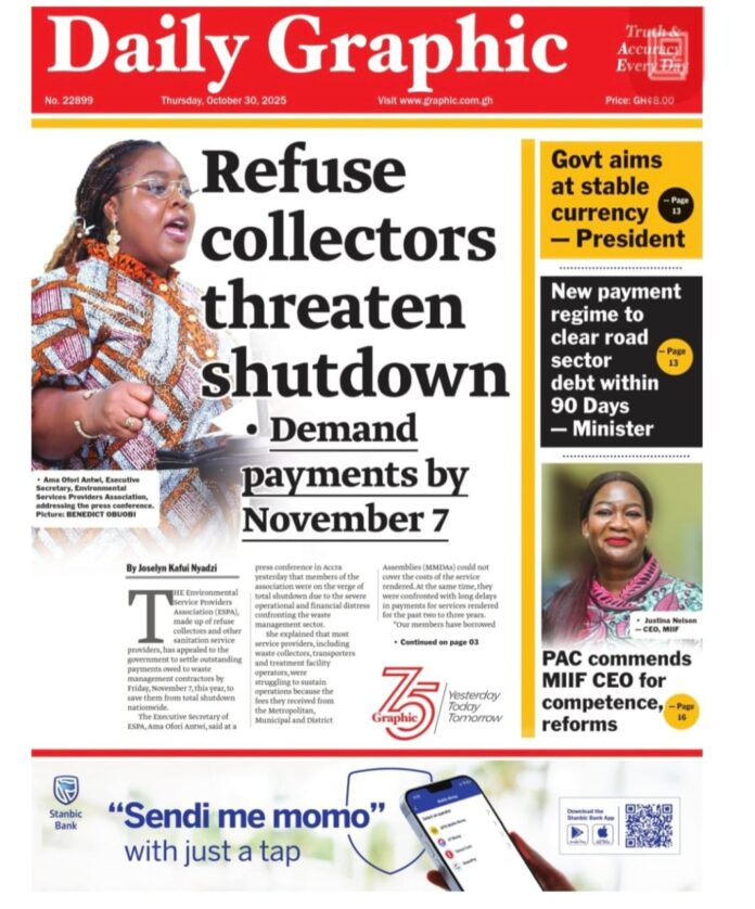 Newspaper headlines: Thursday, October 30, 2025 Newspaper Headlines October 30, 2025 7:46 am - Share FacebookWhatsAppTwitterTelegramEmailPinterestPrint FacebookWhatsAppTwitterTelegramEmailPinterestPrint Previous articleEx-officer guilty of murder of Sonya Massey after she reported suspected intruderNext articleBank of Ghana to develop and test e-Cedi payment system – Vice President TagsNewspaper headlines RELATED ARTICLES Local News This time, president will assent – Bedzrah assures swift passage of Proper Sexuality Bill Local News Okoe-Boye warns Ghana risks double payment with GHIMS contract Crime Three policemen, 4 civilians injured after armed youth attack Nsuaem station over suspect’s arrest