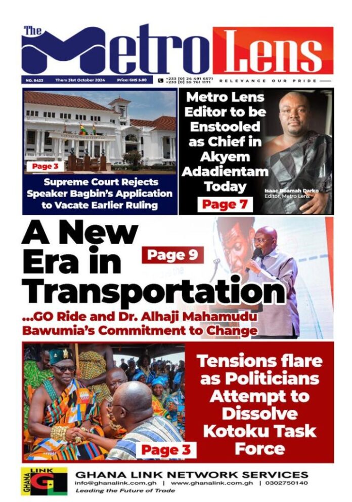 Newspaper headlines: Thursday, October 31, 2024 Newspaper Headlines October 31, 2024 7:43 am - Audio By Carbonatix FacebookWhatsAppTwitterTelegramEmailPinterestPrint Previous articleSupreme Court’s ruling on vacant seats ‘very solid’ – Bobby BansonNext articleBawumia pays glowing tribute to Akua Donkor TagsNewspaper headlines RELATED ARTICLES Local News Minority calls for Lands Minister’s removal over withdrawn Lithium Agreement Entertainment I’m divorced – Nana Ama Mcbrown reveals Local News Obuasi Police arrest 40 suspects in coordinated anti-crime operations