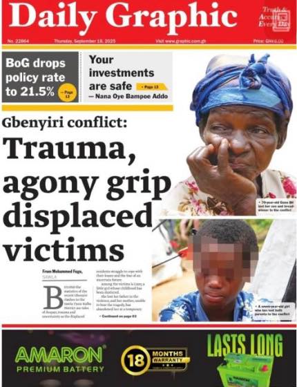 Newspaper headlines: Thursday, September 18, 2025 Newspaper Headlines September 18, 2025 7:04 am - Share FacebookWhatsAppTwitterTelegramEmailPinterestPrint FacebookWhatsAppTwitterTelegramEmailPinterestPrint Previous articleAsantehemaa’s Dote Yie: Live ammunition banned, musketry restricted to skyNext articleKwasi Sibo targets regular Black Stars spot after impressive debut TagsNewspaper headlines RELATED ARTICLES crime Police hunt for man after girlfriend is found dead in guest house at Begoro Local News See where new 198.7 kilometres Accra–Kumasi 6-lane Expressway Project captured in 2026 Budget will pass Local News If you’re too popular with MDAs as Finance Minister, something is wrong – Ato Forson