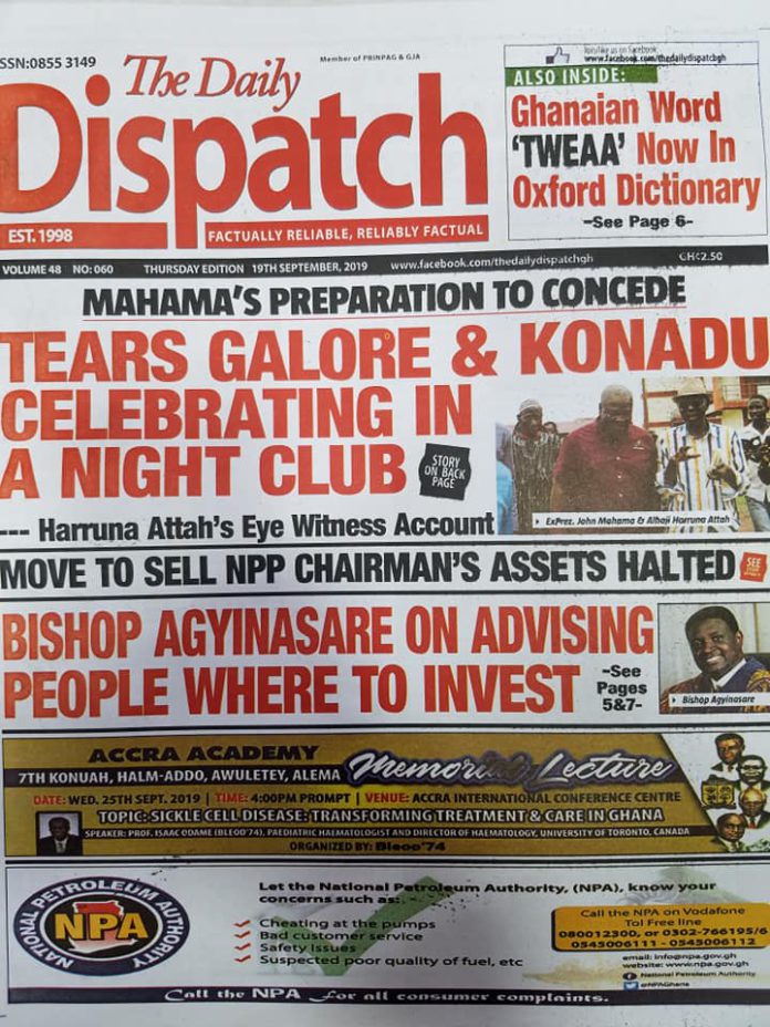 Newspaper Headlines: Thursday, September 19, 2019 Newspaper Headlines September 19, 2019 7:28 am - Audio By Carbonatix FacebookWhatsAppTwitterTelegramEmailPinterestPrint Previous articlePHOTOS: How Nana Oye Lithur ‘slayed’ at 2019 Glitz Style AwardsNext articlePhoto: Pregnant bride dies minutes before her wedding RELATED ARTICLES Newspaper Headlines Newspaper headlines: Monday, November 24, 2025 Newspaper Headlines Newspaper headlines: Friday, November 21, 2025 Newspaper Headlines Newspaper headlines: Thursday, November 20, 2025